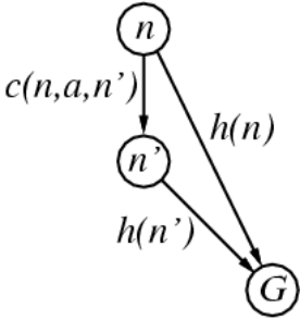 满足一致性的启发式函数需要满足 ,其中 为从 到 的真实代价