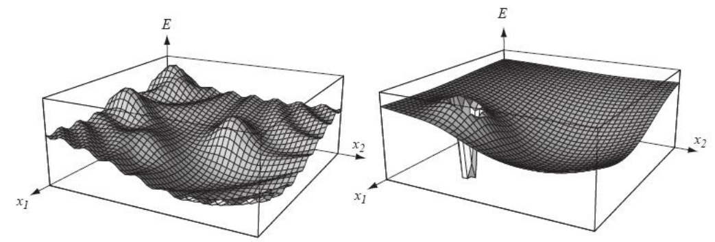 - 需要能量函数比较平滑,否则效果也不好。比如模拟退火比较适用于左边的图,而不适用于右边的图