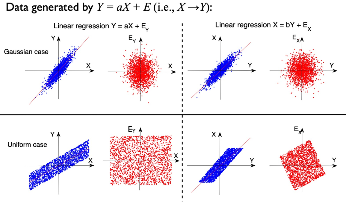 可以发现当 为高斯分布时,因果关系无法区分;但是当 为非高斯分布时(比如图中为均匀分布),那么可以区分,即可以发现此时 与 不独立。