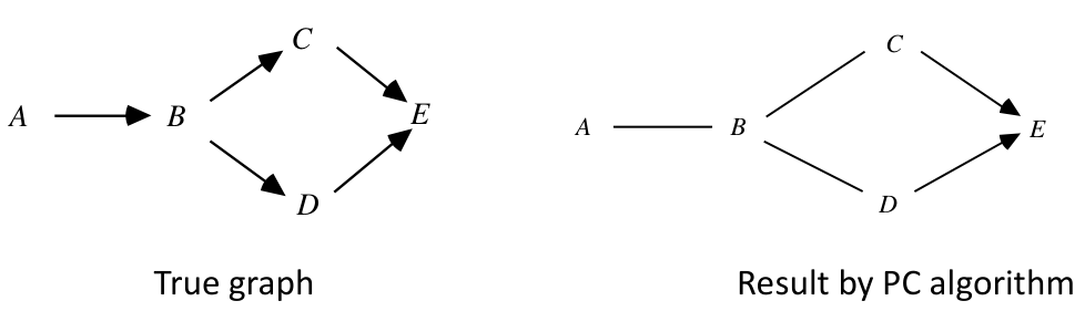- Theorem (Verma and Pearl, 1990): two DAGs are Markov equivalent iff they have the same skeleton and the same v-structures.