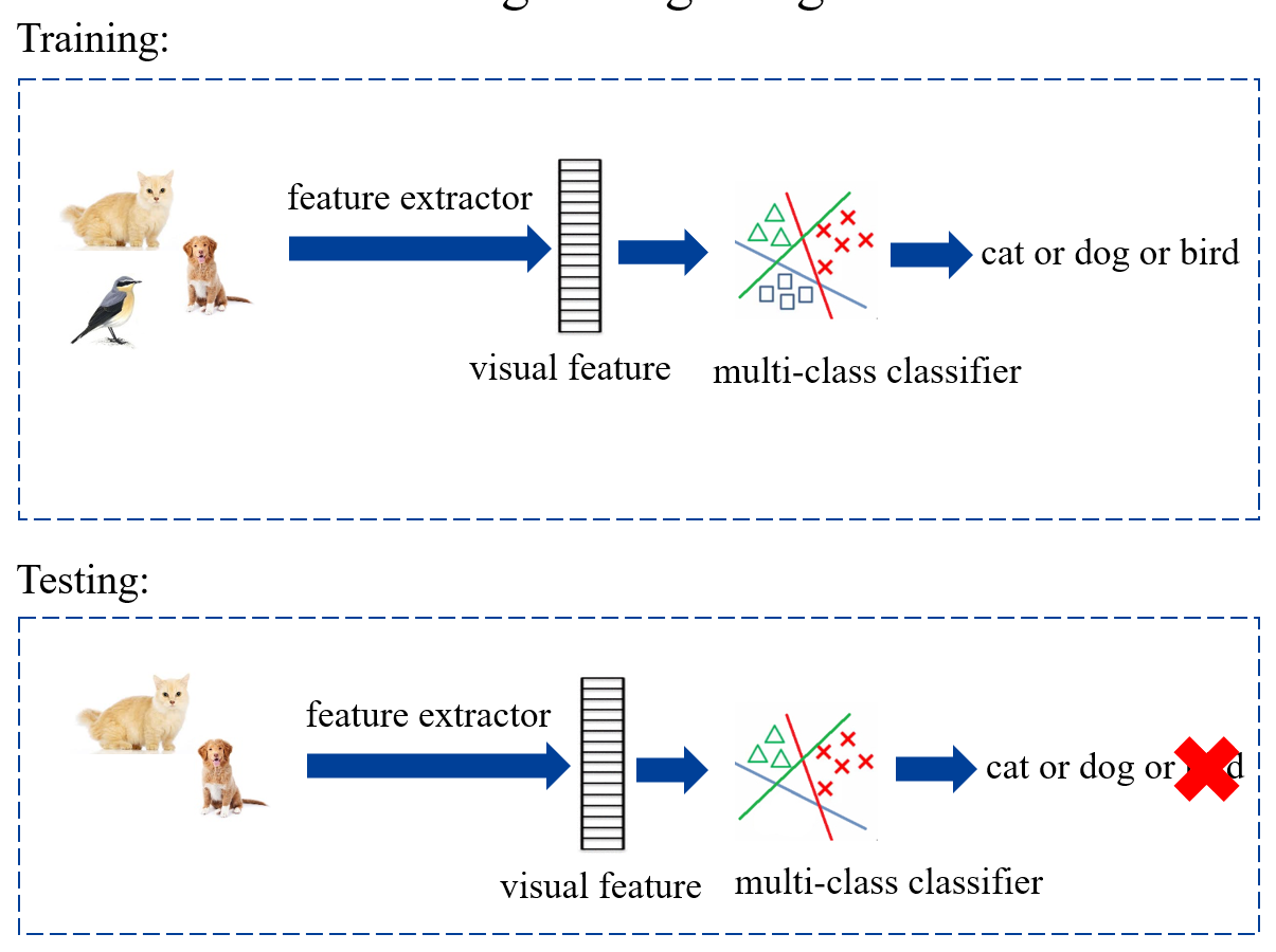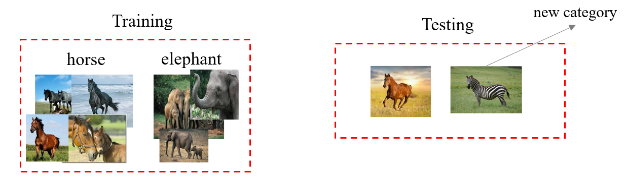 主要解决训练集和测试集在种类上的差异。在之前的机器学中,训练集和测试集的种类总是相同的;而在这里,则需要考虑训练集、测试集种类不完全一样的问题。
