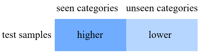 对于 generalized zero-shot learning,之前的方法也都完全适用。但是在测试集上进行预测时,会出现 seen bias,也就是 seen categories 的得分会普遍高于 unseen categories。