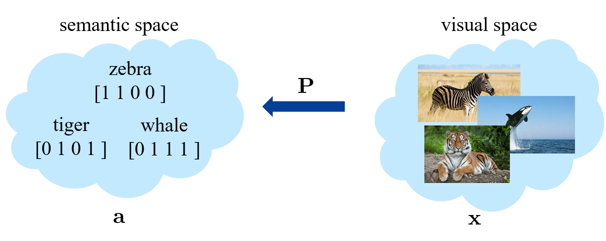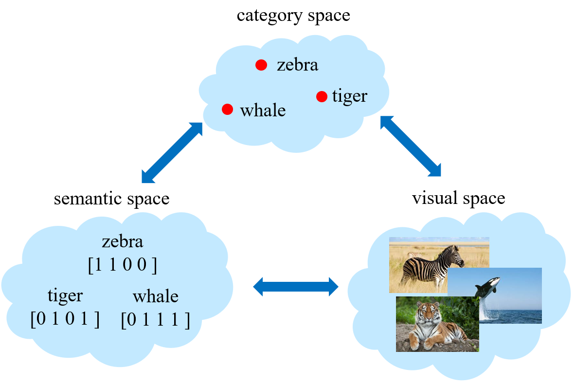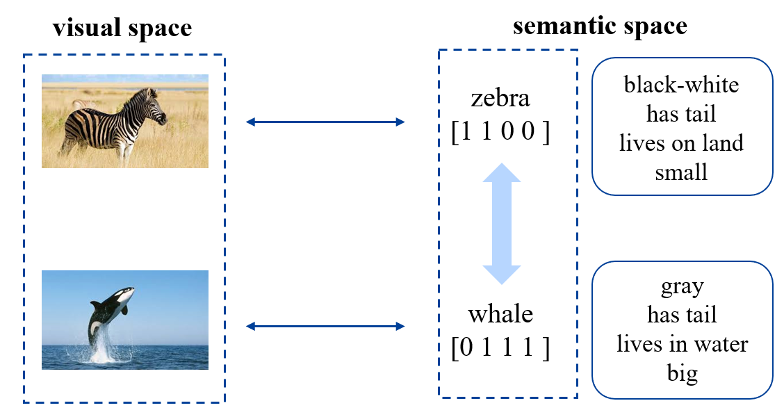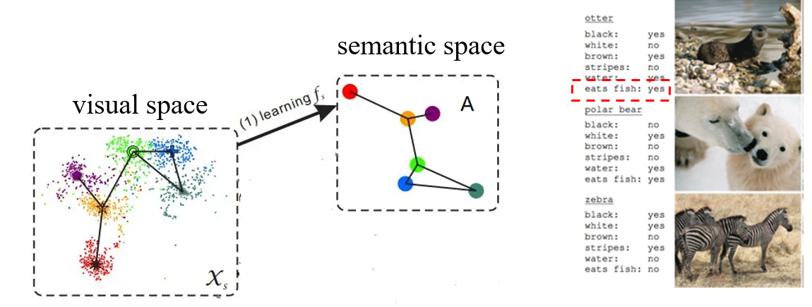seen categories 和 unseen categories 之间利用 category-level 的语义信息(semantic information)进行连接,语义信息包括属性(attributes)或者描述(category descriptions)。对于一张图片,我们会将其从视觉空间(visual space)映射到语义空间(semantic space)。
