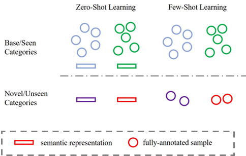 下图展示 zero-shot 和 few-shot 的不同。zero-shot 需要 semantic 的信息,而 few-shot 通常不用。