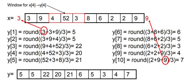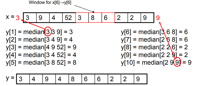 在序列中取一个滑动窗口,让窗口中间的数字取中值。对于边界窗口可能会越出序列边界的问题,这个时候可以做填充(padding),可以直接取 或者复制边界的数字。