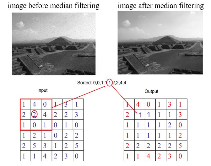 比如对于下图,使用 median filter 之后,第一个序列中间的 处理完之后还是 ,保留了中间的分界线,因此称为能够保存边缘。