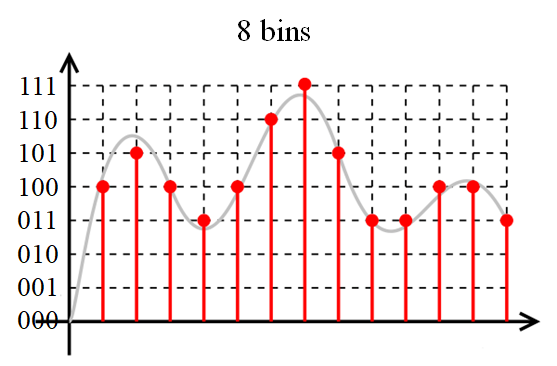 比如想要把一个连续的序列量化到 8 bins 的离散数据,如图所示: