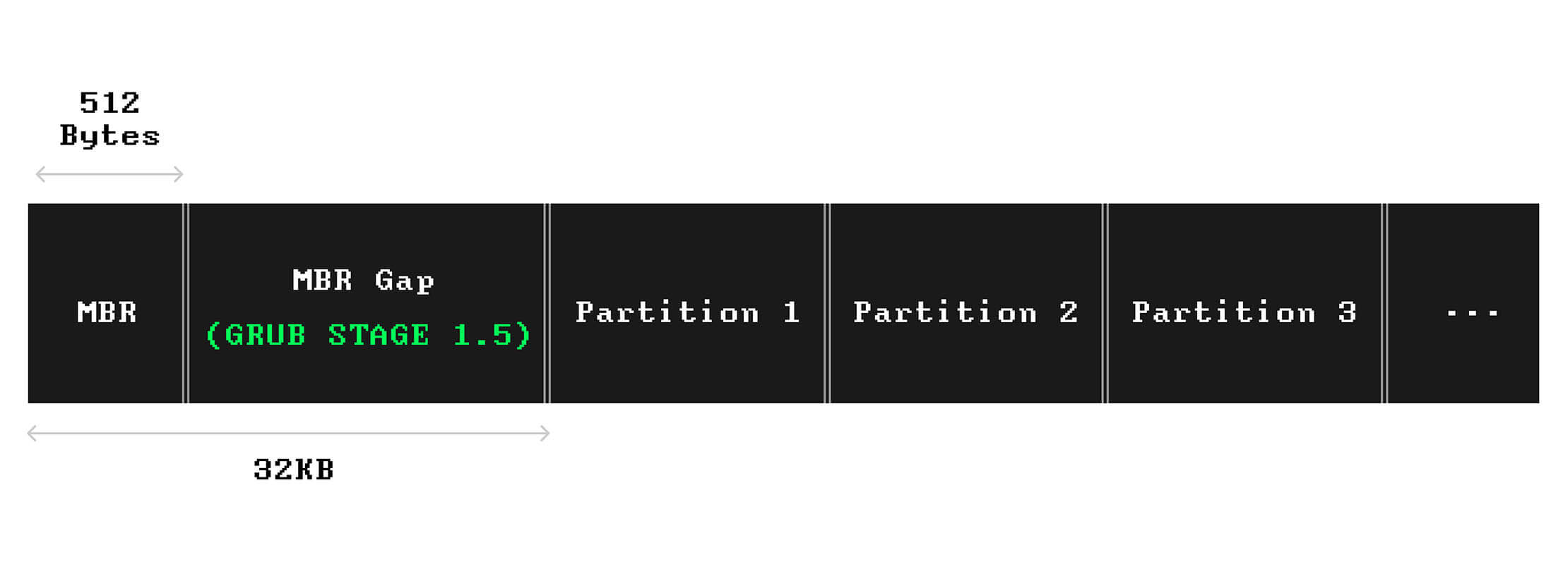 - 利用MBR间隙,引导加载程序(例如 GRUB 2)存储其功能的另一阶段。GRUB 将此称为引导加载程序的第1.5个阶段,其中包含文件系统驱动程序。1.5阶段使 GRUB 的下一阶段可以处理文件,而不再是再向第一阶段引导加载程序那样从存储设备中加载原始数据。