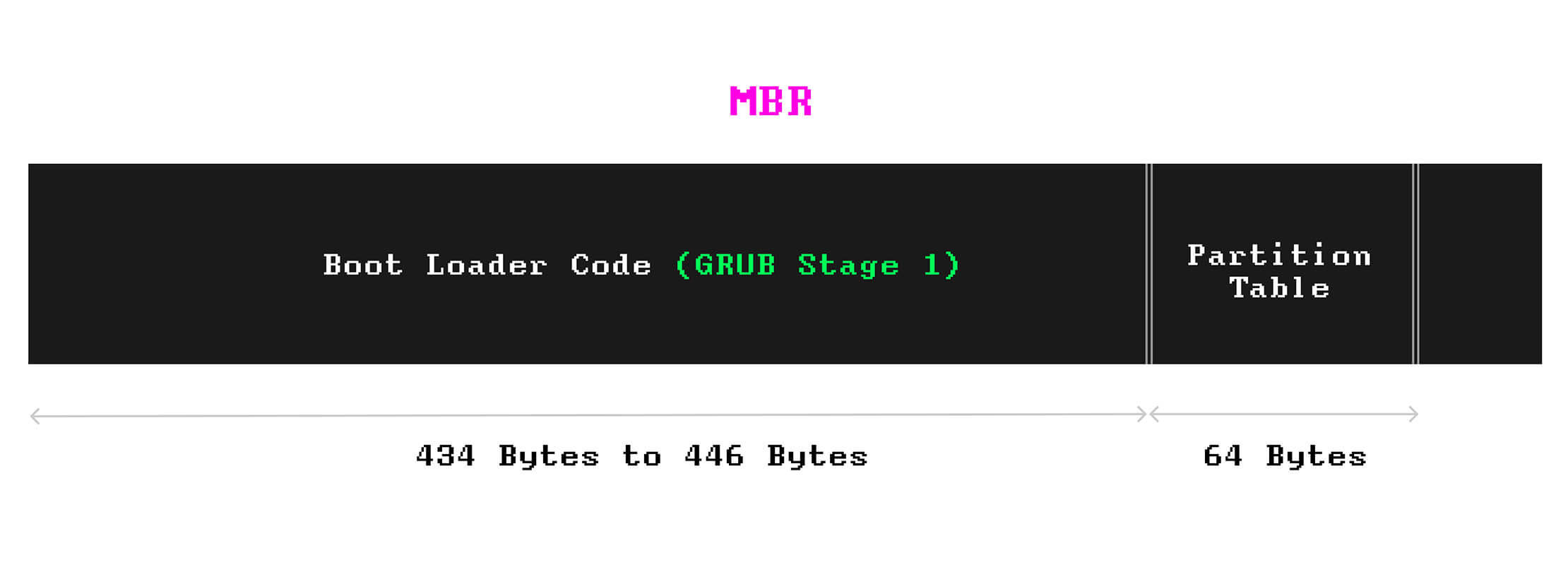 MBR 中的引导加载程序代码占用 MBR 512字节空间中的 434 字节至 446 字节,另有 64 字节分配给了分区表,其中最多包含四个分区的信息。446 字节并不足以容纳很多的代码,正因如此,复杂的引导加载程序(例如 Linux 上的 GRUB 2)会将其功能切分为多个部分或多个阶段: