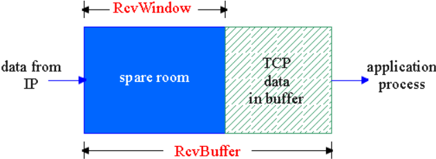 接收方将 RcvWindow 放在报头中,向发送方通告接收缓存的可用空间,从而发送方限制未确认的字节数不超过接收窗口的大小,即: