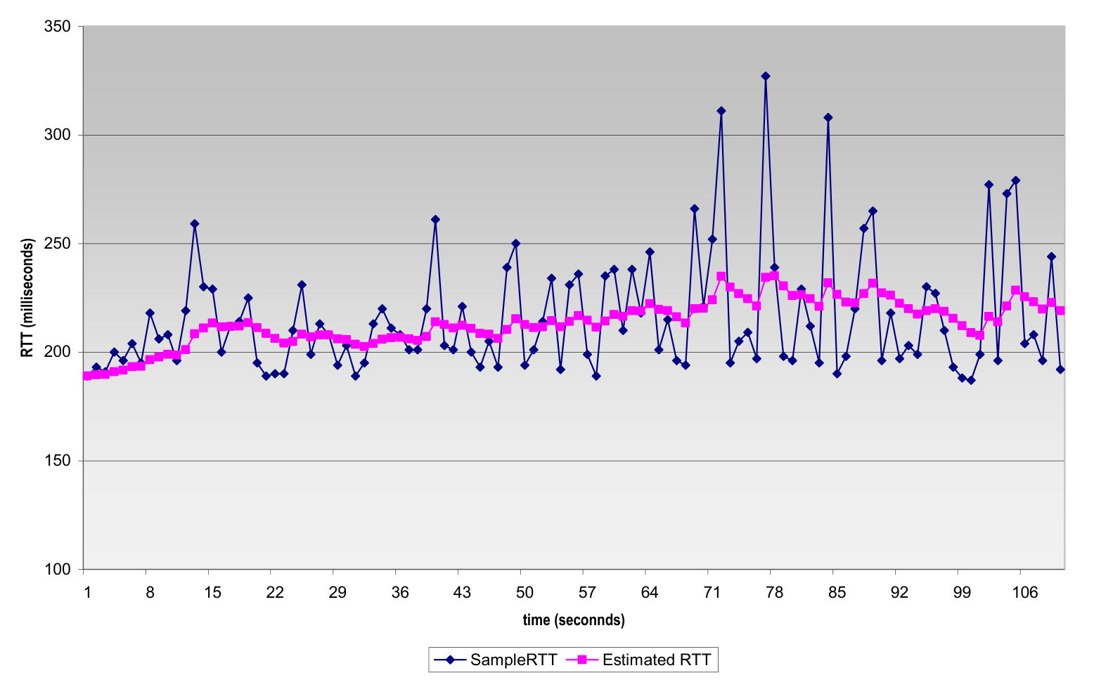 - EstimatedRTT:由于 SampleRTT 波动很大,更有意义的是计算其平均值,该平均值即为 EstimatedRTT。